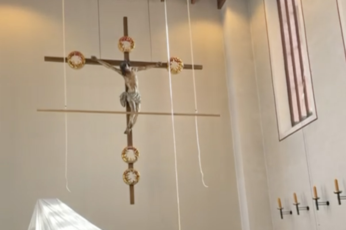 Bisher wurde das Tuch während der Liturgie langsam über ein Seilsystem entfernt. Die Vorbereitung dafür fand jedoch in luftiger Höhe über dem Altar statt – nicht ganz ohne Risiko.